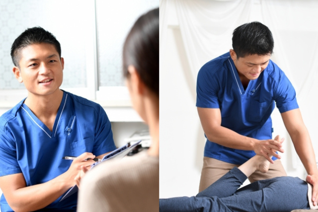 まず、問診(お話をお伺いする)、視診(姿勢や動きを視覚で確認する)、触診(実際に触れて関節や筋肉の状態を確認する)などを通じて、痛みの原因となっている患部の状態を詳細に把握します。